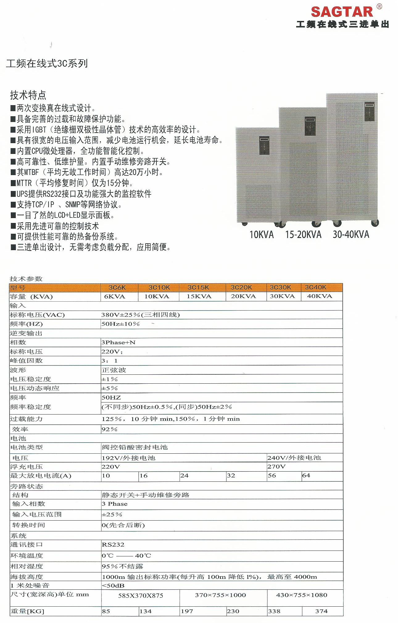 美国山特UPS电源工频式三进单出6KVA-40KVA产品参数: